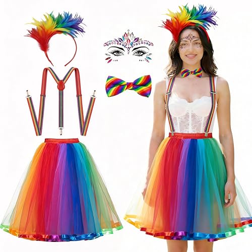 Regenbogen Kostüm Damen Karneval Tüllrock mit Feder Haarreif Bunt Hosenträger,Regenbogen,Rock,Fliege,Gesichtssteine,50er Jahre Outfit Damen,Halloween Karneval Fasching kostüm Tütü Damen Mädchen