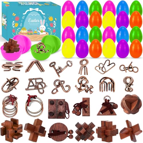 24 Stück Gefüllte Ostereier mit Knobelspiele, Bunt Vorgefüllte Kunststoff Ostern Eier mit verschiedenen Metall Knobelei und Holzk, 3D Puzzle, für Ostern Partyzubehör, Osterkorb Füllstoffe, Osternest