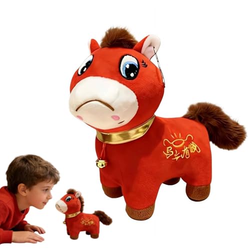 2026 Jahr des Pferdes Plüsch – 24,9 cm rotes glückliches chinesisches Mond-Neujahrs-Sternzeichen-Maskottchen, weinendes Pferd, Plüschfigur mit Glücks-Aufdruck, Heim-Shop, Tischdekoration, festliches
