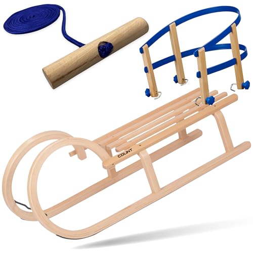 Explorer Colint Holzschlitten mit Rückenlehne für Kinder ab 1 Jahr und Erwachsene Set Schlitten Holz Hörnerschlitten mit Leine in Blau 110cm