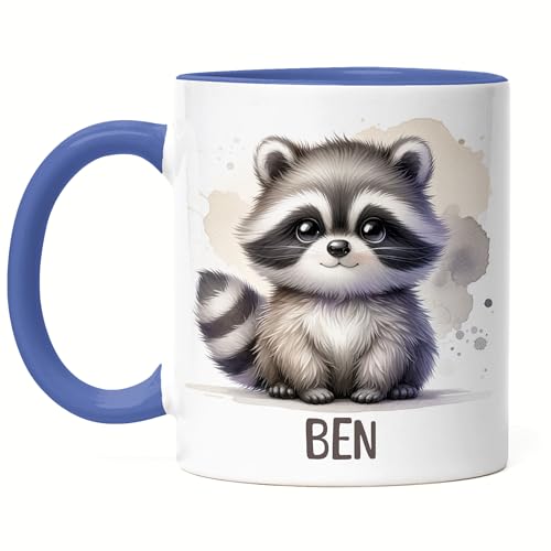 Kiddle-Design Kindertasse mit Namen Personalisiert, Personalisierte Tasse Kinder mit Waschbär, Namenstasse Waschbärtasse, Kinderbecher als Geschenk zur Taufe, Geburt Weihnachten - Tasse Blau