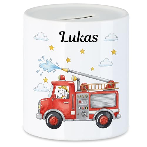 Kiddle-Design Spardose Kinder mit Namen Personalisiert, Feuerwehrauto Motiv Geschenk für Kinder Geburtstag, Weihnachten, Geburt und Taufe – Sparschwein, Geldgeschenk, Wunscherfüller