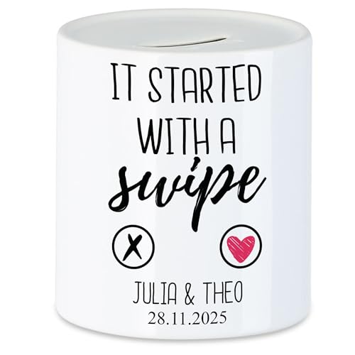 Kiddle-Design Paar Spardose Personalisiert mit Namen, It Started with a Swipe, Valentinstag Jahrestag Hochzeitstag Geschenk für Pärchen Freund und Freundin, Internet Dating witzige Sparbüchse